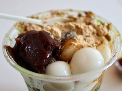 抹茶シェーブは具だくさん。小豆あんに白玉、きな粉がトッピングされています。