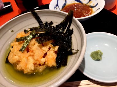 まずは、海老の天ぷらがカラリと揚がりました。天ぷらつゆに大根おろしやお塩など好みに合わせて、揚げたてのほくほくの天ぷらが楽しめます。