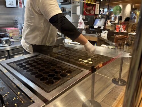 築地銀だこのたこ焼き器は、ブルブル震えて、自動でたこ焼きが回り満遍なく焼けるのが特徴。