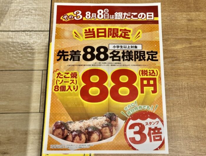 ↑のたこ焼きが88円になります。その他のたこ焼きは通常の値段です。