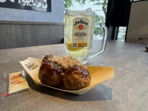 まずは定番のたこ焼(4個税込374円)とジムビームハイボール(税込429円)!!!