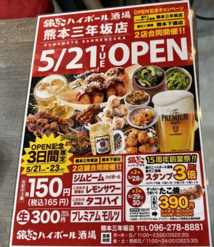 いよいよ5月21日にグランドオープンをする銀だこハイボール酒場 熊本三年坂店。