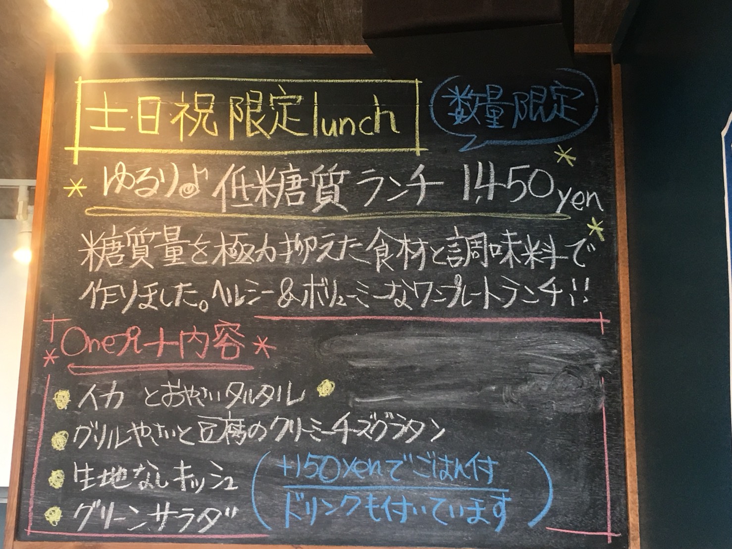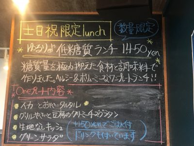 店内の黒板には土日祝限定の低糖質ランチも…。糖質が気になる方も楽しめるランチです。