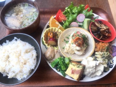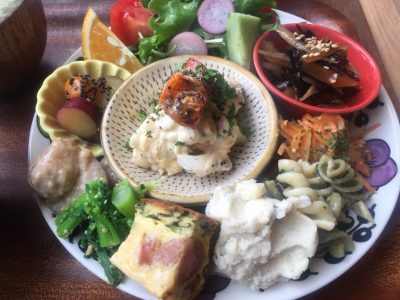 生野菜のサラダに、キッシュ、人参サラダ、里芋やさつま芋の煮物などが、お皿の上にぎっしり盛られています。一品一品、丁寧に味付けされていて、どれを食べてもおいしい!