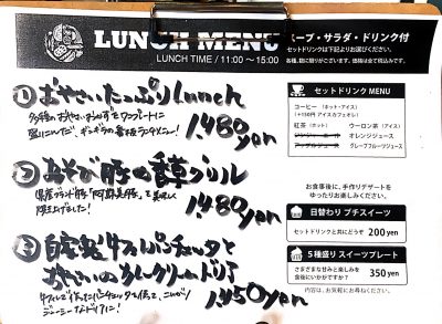 こちらがランチメニュー。お野菜メイン、お肉メイン、ドリアなどいろいろな種類から選べます。