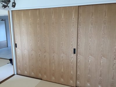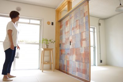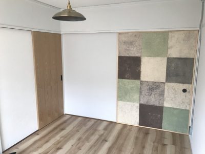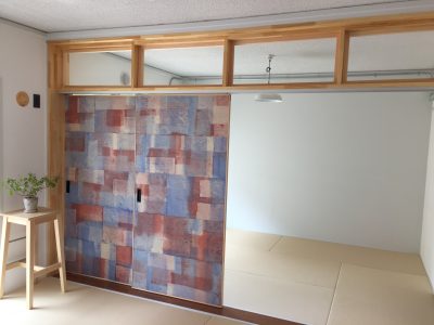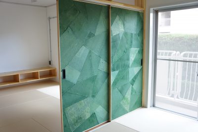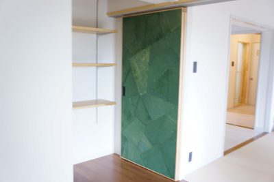 別の部屋でもアクセントとして和紙を使用。こうなると単純に「押し入れの扉」からアクセントクロスに格上されるから不思議です。
