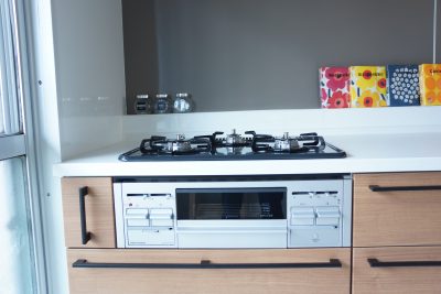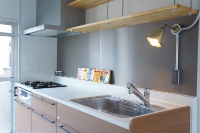 水回りはすべて新品に交換。吊戸棚だった部分にはオープン型の壁面収納を設置することで流行りの【見せる収納】になりますし、通気性も抜群です。