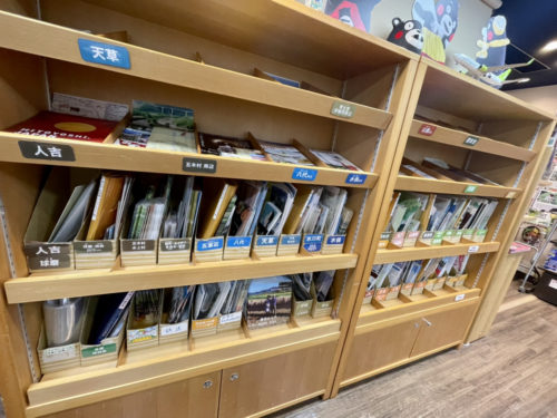2階へ上がると、観光情報コーナーとくまモングッズ売り場。観光情報コーナーには、たくさんの市町村や観光地のリーフレット類がそろっていました。