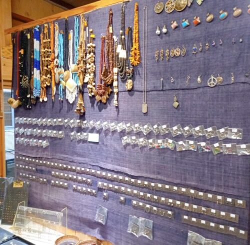 サイズ展開が幅広いので、男女ともに使いやすそうなブレスレットやネックレス、ピアスなどが並べられた棚。