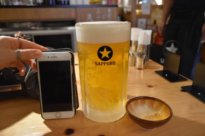 頼むと、ビールをなみなみと注いだ巨大ジョッキが運ばれてきました。iPhone8を横に置いてみましたが、めちゃくちゃでかいです。ジョッキの重さは1キロ、ビールは1ℓ。1ℓ=1キロなので、合計2キロです。そらでかいはずです。運動不足の私は、片手で持てませんでした。