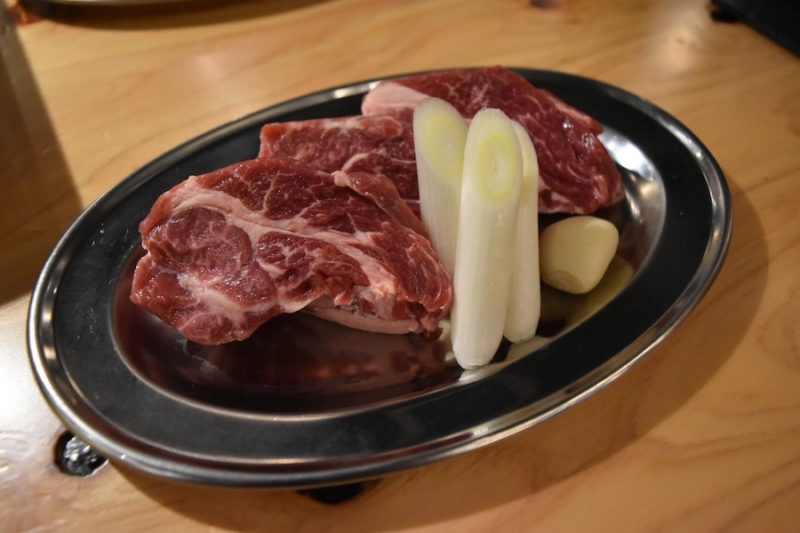 早速、店長さんゴリ押しの厚みがある「特上肩ロース」(一人前850円)を注文しました。北海道千歳にある精肉店の老舗から直接買い付けた、綺麗な赤色の分厚い生ラム肉です。