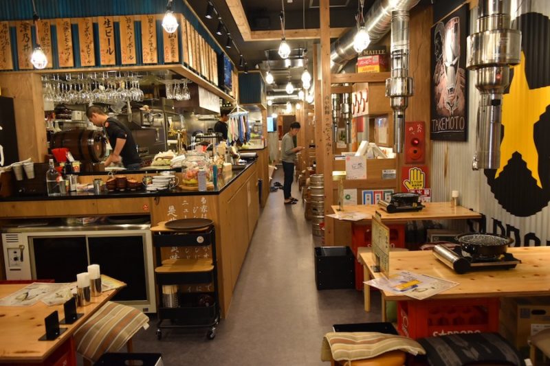 ビールケースを重ねて天板をのせたテーブル、トタン風の壁などなど、大衆居酒屋を思わせる店内。昭和世代の皆さまは、どこか懐かしく感じるのではないでしょうか。