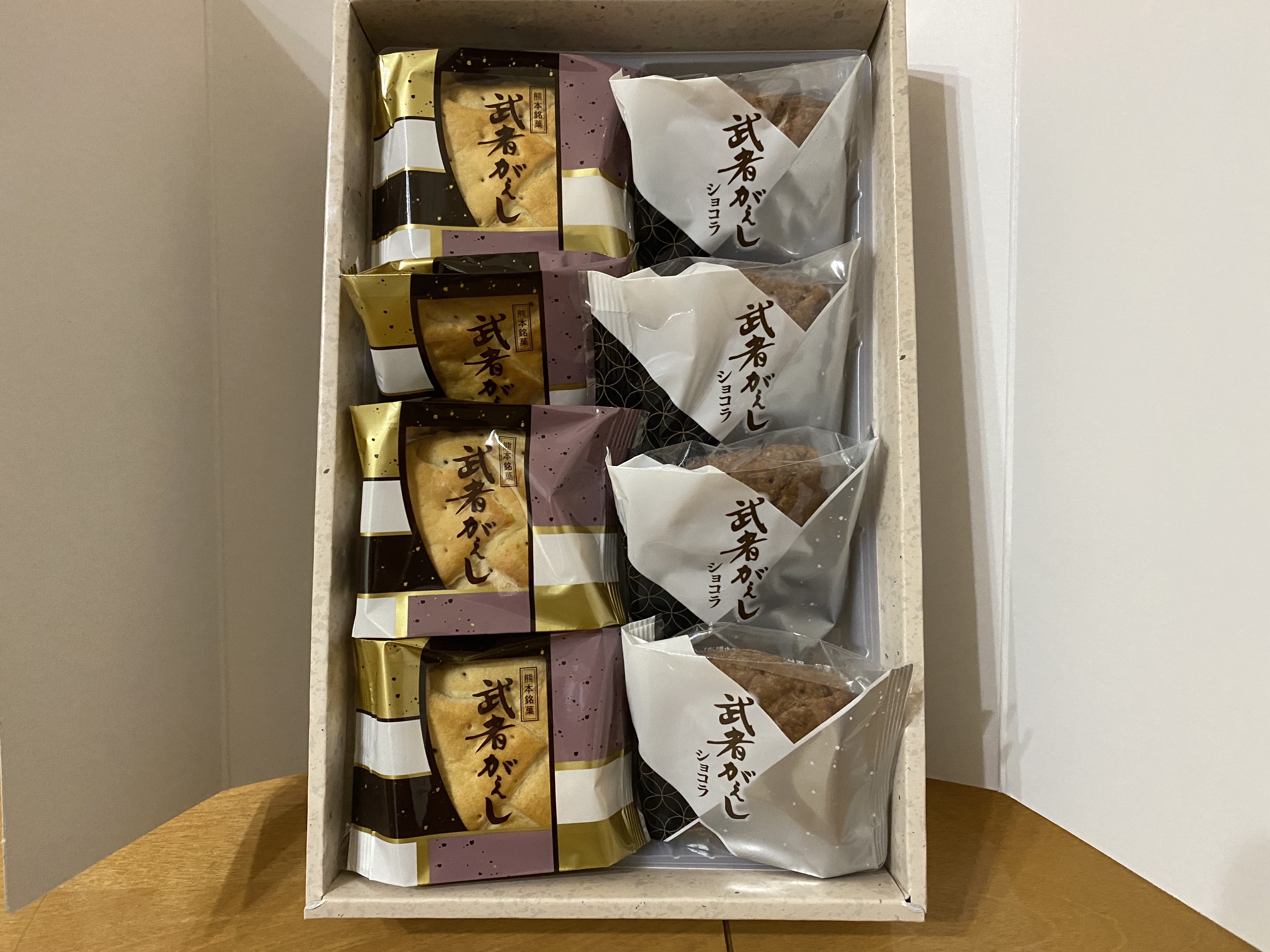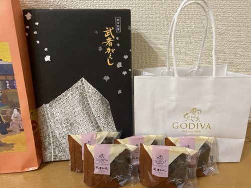 香梅で購入した8個入りの「武者がえし」とGODIVAの「武者がえしチョコレート」