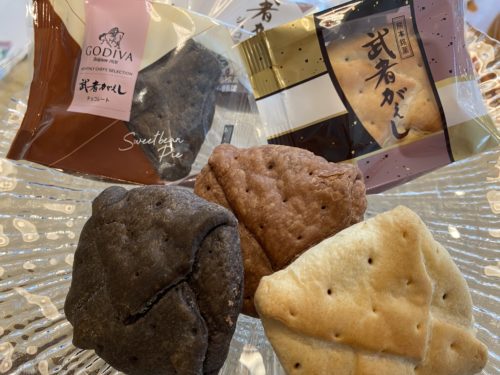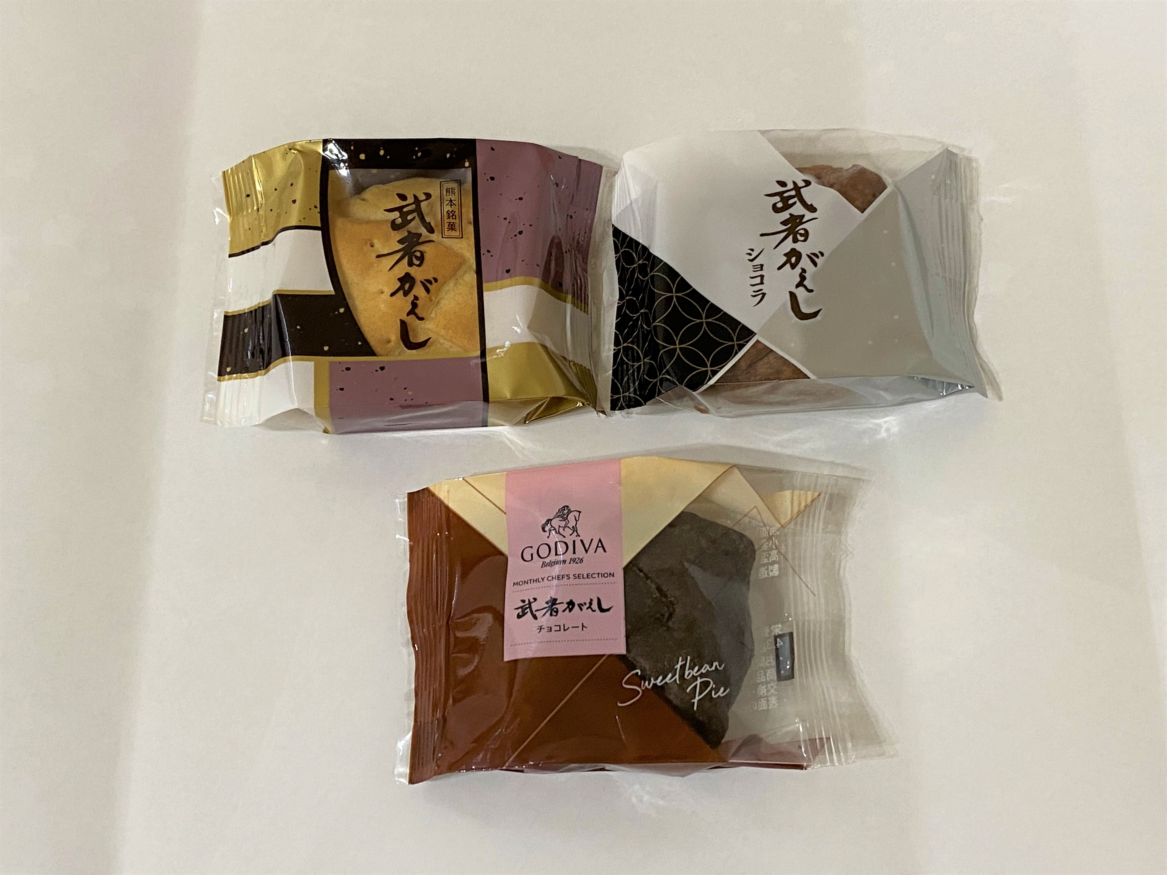 左から香梅の「武者がえし」、「武者がえしショコラ」、GODIVAの「武者がえしチョコレート」、もうどれも美味しそう!