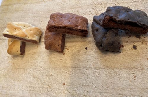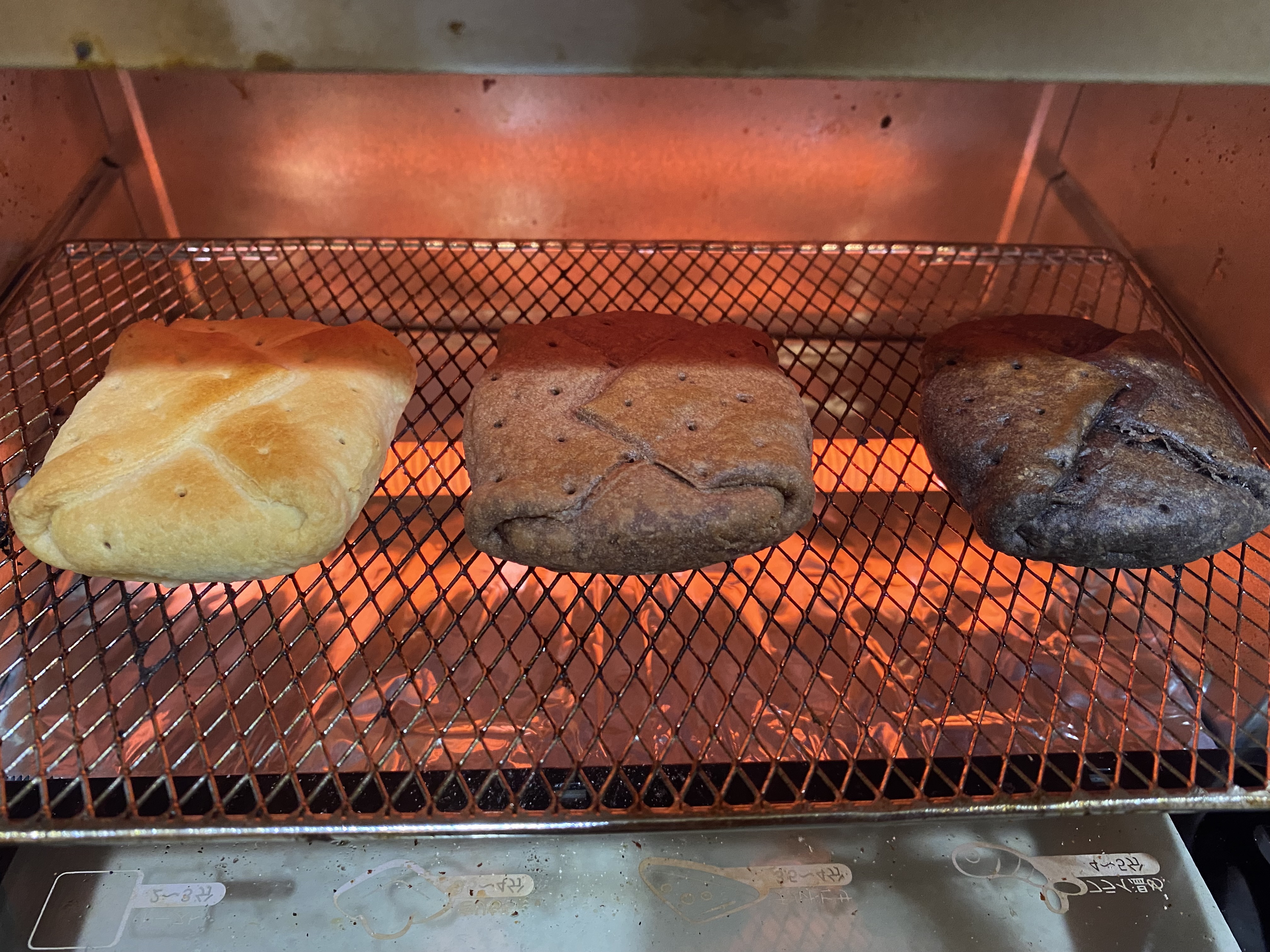 武者がえしはトースターで3分ほど焼くと、出来立てのようで美味しいと聞いたことがあるので、並べて焼いてみました。1分ほど経ったところでゴディバの「武者がえしチョコレート」からいい香り。よく見ると、パイの隙間からチョコレートがフツフツと溶け出しているようです。