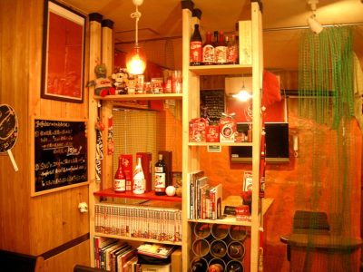 店内あちこちが広島カープ一色!カープラベルのお酒なども勢ぞろいしています。この棚の向こうは旧広島市民球場のブルペンをイメージした個室スペースだそうです!