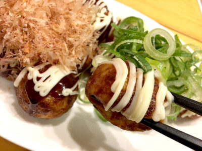 熱々のソースたこ焼きには鰹節とネギがたっぷり!たこ焼きは出汁にもこだわっているそうで、外がカリッと中がトロリで最高の逸品です。たこ焼きは持ち帰りにも対応しております。