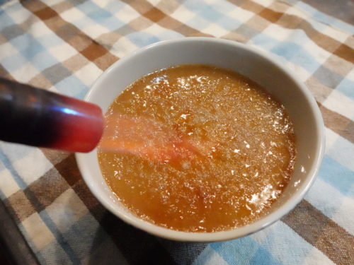 「茶わん蒸し」の上に上白糖を乗せ、バーナーできつね色になるまで炙ります。そうすると!あら不思議!お砂糖が溶けてカラメル飴(あめ)の膜ができちゃうんですね!