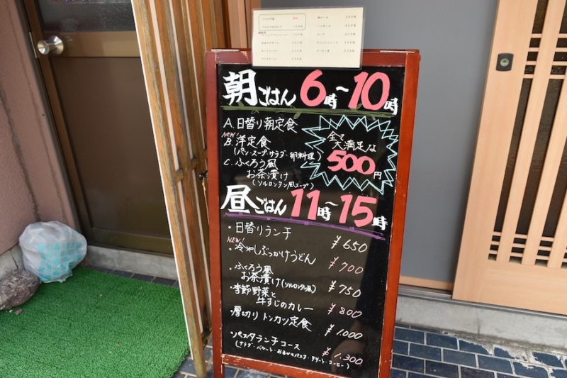 入り口横にあったメニュー表。確かに朝6時から開いていますし、ワンコイン! どんなもんなのか早速入って確かめましょう。
