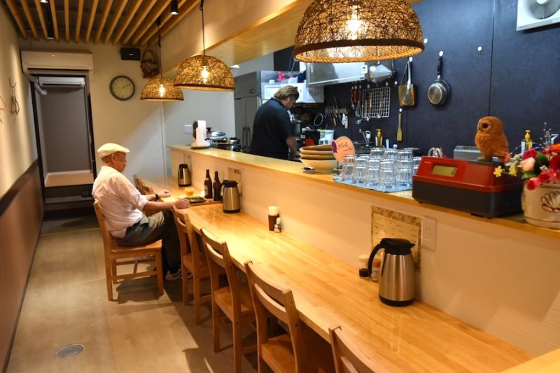 カウンター席と小上がりのお座敷がある店内。暖かみのある照明とカウンターテーブルで、朝のドタバタした気持ちが落ち着いてきました。