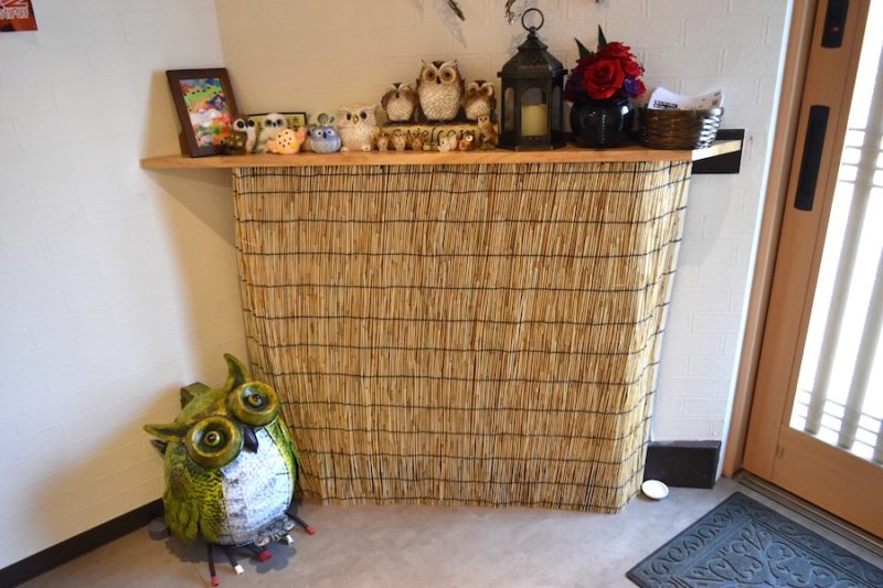店名の「ごはんや ふくろう」にちなんで、入り口にはフクロウの置物がいっぱいあります。