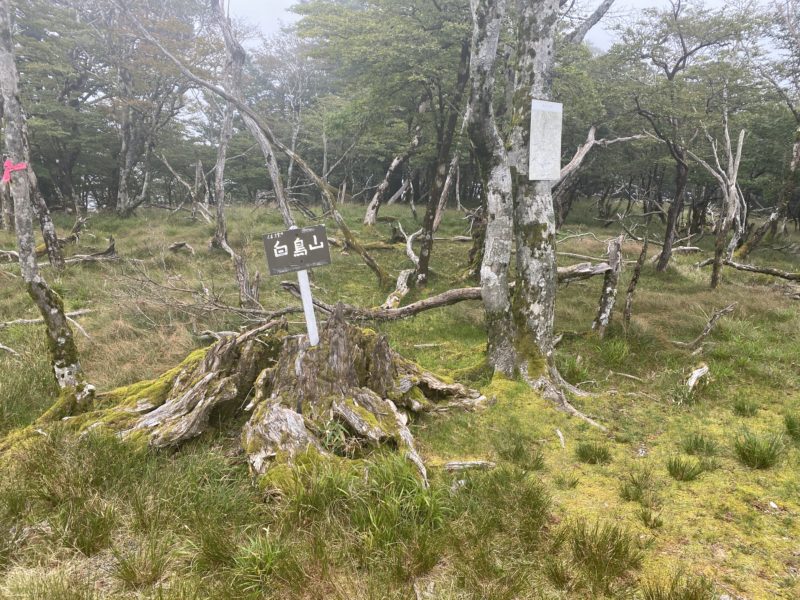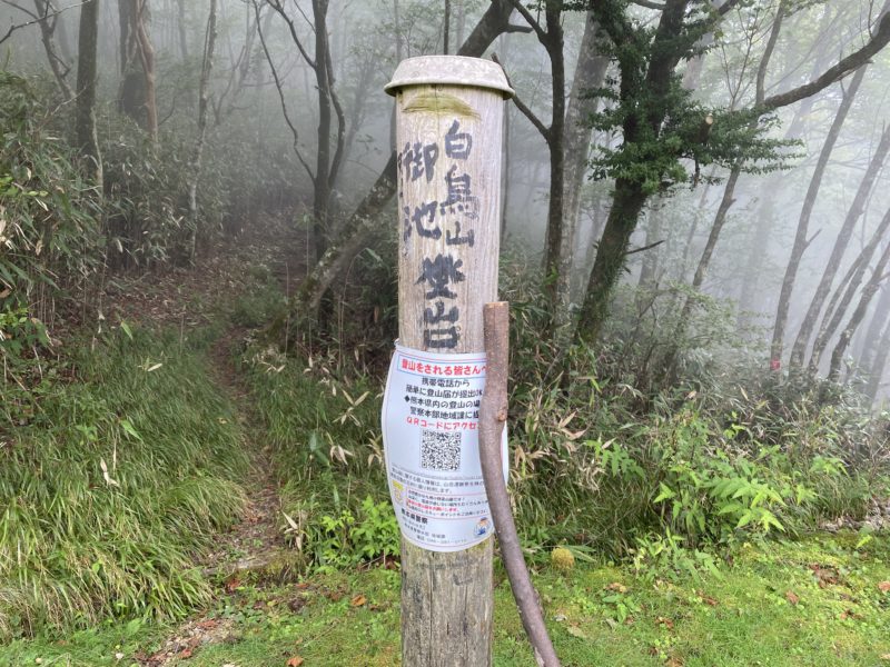 車で細い道を突き進みたどり着いた白鳥山の登山口。入り口にして山奥、すでにかなりの標高で霧が覆っていました。