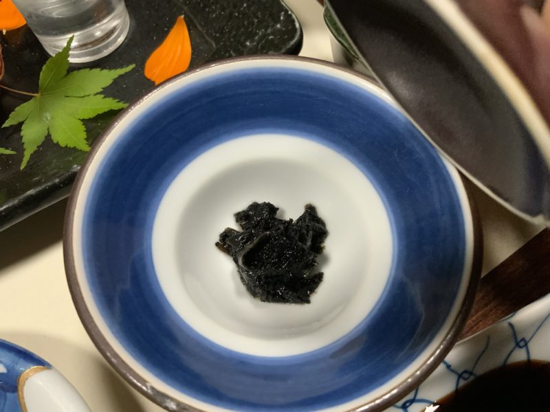 小鉢の蓋を開けると出てくるこの黒いナニカは、イワダケという崖に生えるという珍味で超激レア食材らしいです。