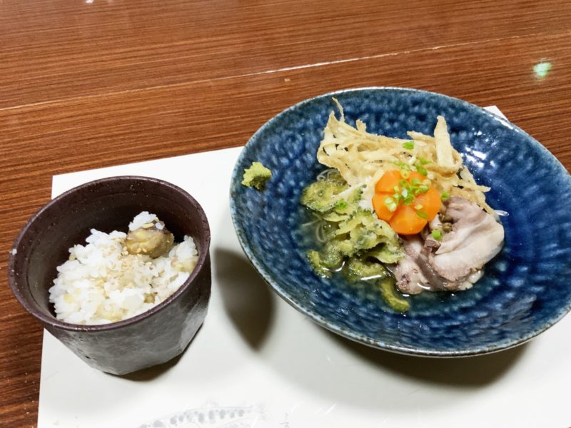そして、最後に栗ご飯と椎茸素麺。椎茸素麺にはイノシシ肉を山椒で炒めたものと、ゴボウとゴーヤの天ぷらが乗っています。