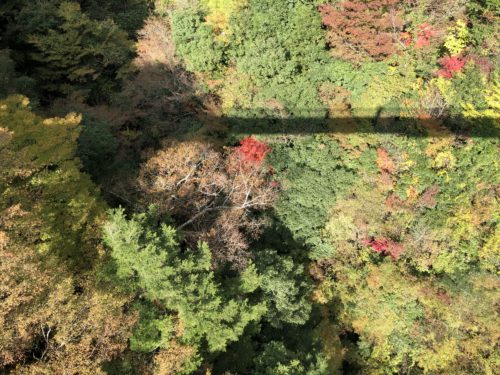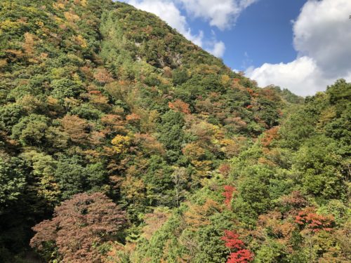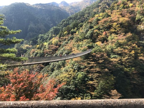 つり橋を渡りながら、横を見るとボチボチ紅葉しはじめた山々。はあ道中険しかったけど、つり橋揺れて若干怖いけど、来てよかっ…