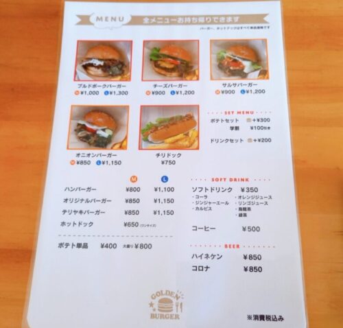 GOLDEN BURGERのメニューは全品テイクアウトOK。