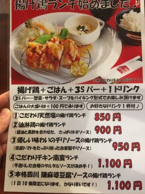 そしてこちらが先月からスタートした揚げ鶏ランチ。油淋鶏やチキン南蛮などがあり、こちらは850円~とさらにお得な料金設定となっています。