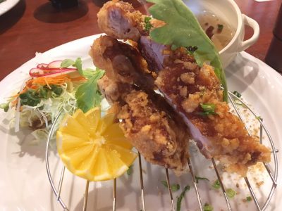 そしてこちらは、油淋鶏の揚げ鶏ランチ。鶏肉がそびえたっており、こちらもボリューム満点!サクサクでジューシーな揚げ鶏と、さっぱりしたネギソースがマッチしていました。