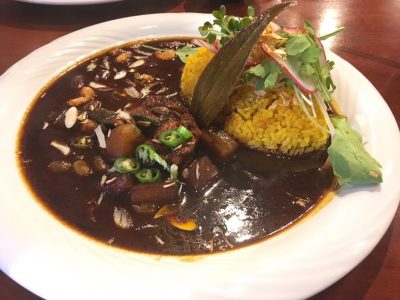 大きなお皿にボリュームたっぷりのカリー。柔らかいチキンのほかに、豆やじゃがいも、オクラ、カシューナッツやアーモンドスライスまでトッピングされており、メニュー写真よりも豪華!味もちょっとエスニック風で深い味わいでした。