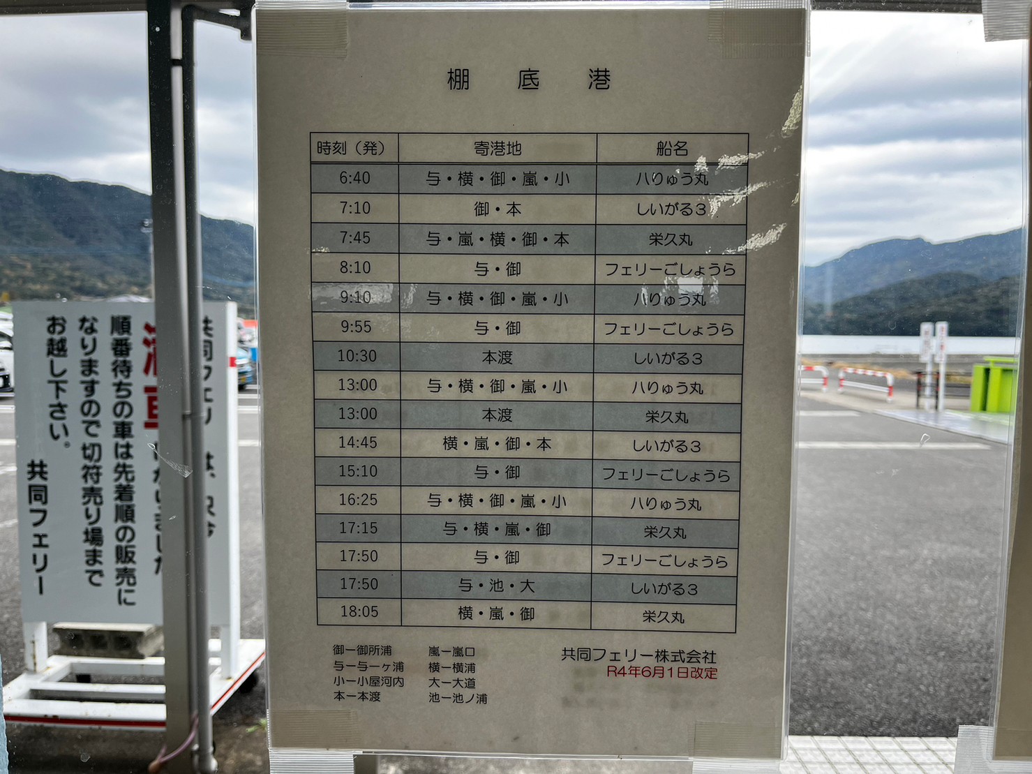 棚底港からカーフェリーが出ています。有料駐車場もあるので、車を停めてフェリーに乗ることも可能です。