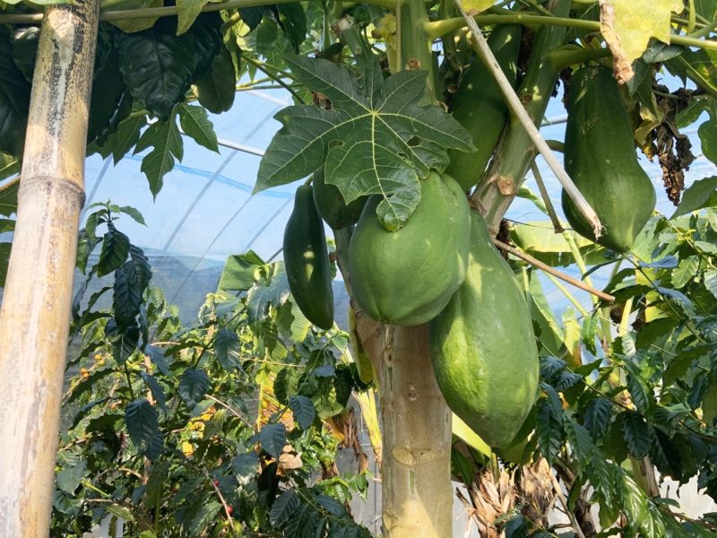 コーヒーに紛れて、パパイヤが実をつけていました。