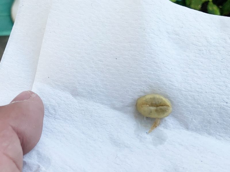 ぺっとするとこんな感じの種子が出てきます。これを割って中から出てくるのがコーヒー豆。それを焙煎して挽いてお湯で抽出したのが私達が普段、口にするコーヒーになります。
