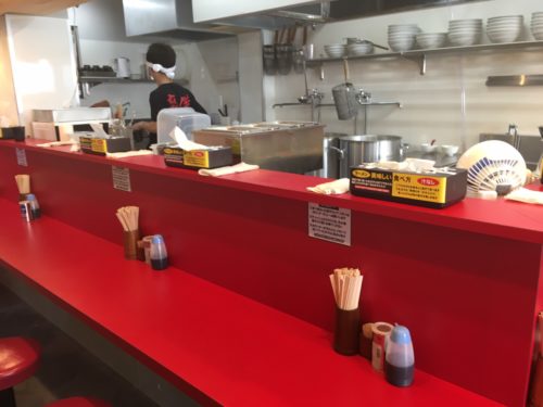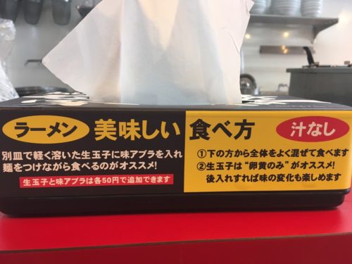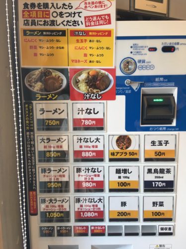 まずは入口入ってすぐの券売機で、食券を購入します。普通のラーメンと汁なしの2種類から選べます。