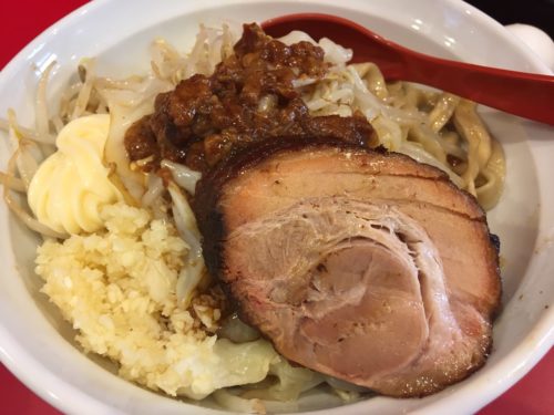 貧乏性の私、「トッピング全部無料なら、全部アリアリがお得だよね」という信念のもと、生卵あり・にんにくマシ・脂マシ・マヨネーズありの汁なしを注文してみました。名付けて、わがまま欲張り汁なし!