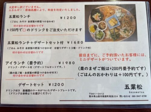 栗園の栗に、農園でとれた野菜を使った、手作りの美味しいランチを味わえて、さらにお花の苗やハンドメイド作品などのお買い物も楽しめる「五葉松」。菊鹿町の隠れた名店で、おすすめです!