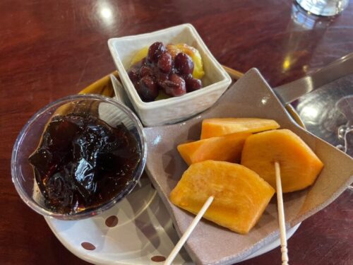 デザートは通常2種類だそうで、栗の小豆餡添えとコーヒーゼリーがありましたが、「今日はちょうど柿もあったので…」と柿までついた、豪華3点盛り!