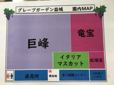 園内MAPをみると、エリアごとに品種が分けられています。今の時期は巨峰と竜宝が食べ頃とのこと。9月になると、マスカットなども食べられるそうです。