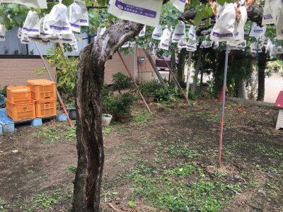 こちらは開園当初から植えられている樹齢43年のぶどうの木です。中は空洞になっていますが、それでも現役で、たくさんのぶどうを実らせています。厳しい安全基準のもとで生産されている減農薬・有機栽培のぶどうなので、安心して食べられます。