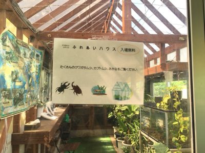 園内には入場無料のふれあいハウスがあり、クワガタムシ、かぶと虫、魚が展示されています。