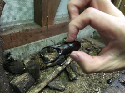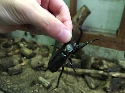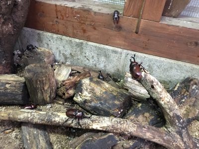 そして、ふれあいハウスの奥の小屋には、たくさんのかぶと虫とクワガタが!!