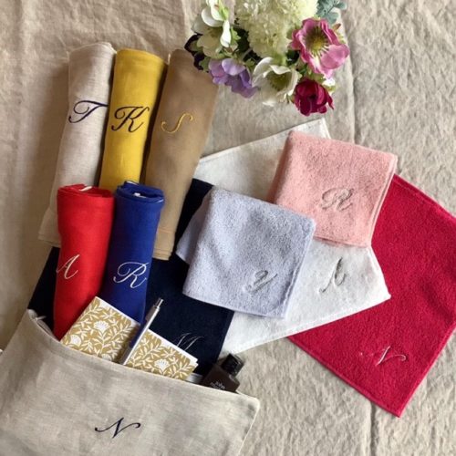 写真のイニシャル入りハンドタオルとリネン素材のバッグインバッグは、プチギフトとして人気だそうです。大切な方へ、お世話になった方への感謝の気持ちを伝えたい時の贈り物としてお薦めです。イニシャル入りのトートバッグもありますよ。男女問わないギフトとして是非選んでみてはいかがでしょうか?