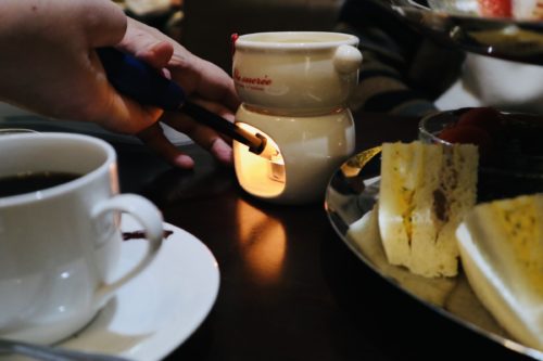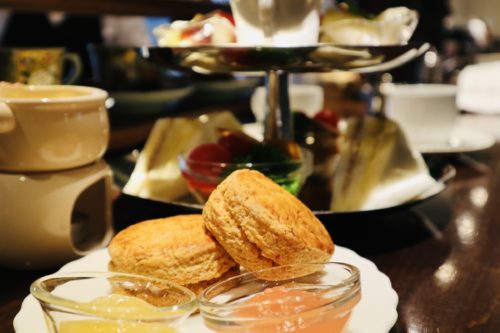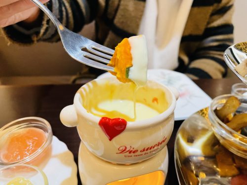 こちらは、アフタヌーンティーセット、セットドリンク4杯、手作りスコーンとジャム、チーズフォンデュ。お値段は季節によって変わりますが、こちらの撮影時は4200円でした(二人分)。