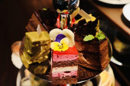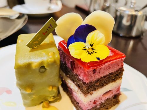三段目は三種類のケーキが楽しめます。色とりどり。ピスタチオのケーキ、フランボワーズのケーキ。チョコレートのケーキ。いつもショーケースの前で迷ってしまうものが、こちらの銀のお皿に勢ぞろい。