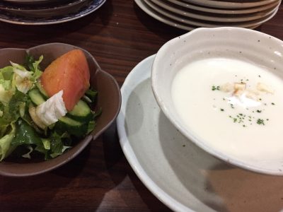 セットだと、このオムライスにサラダ、スープ(写真はカブのポタージュ)、珈琲、デザートがついて1200円です。
