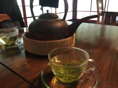 お茶はガラスの容器に鮮やかな黄緑色の茶葉。飲んでみると、多少の苦味はあるものの、それすらさわやかに感じられるほどの飲みやすさ。