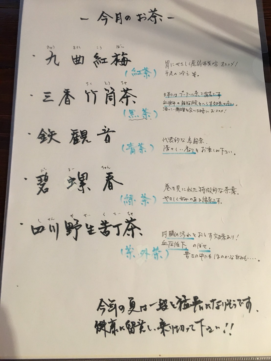 お茶はこちらのメニューの中から選べます。紅茶・黒茶・青茶などがあり、健康効果や味のコメントもついているので、選ぶ時の参考になります。「今年の夏は一段と猛暑になりそうです。健康に留意し、乗り切って下さい!!」というあたたかいメッセージまで…!思わぬエールに、「えぇ、乗り切りますとも!」とこちらも気合いが入ります。